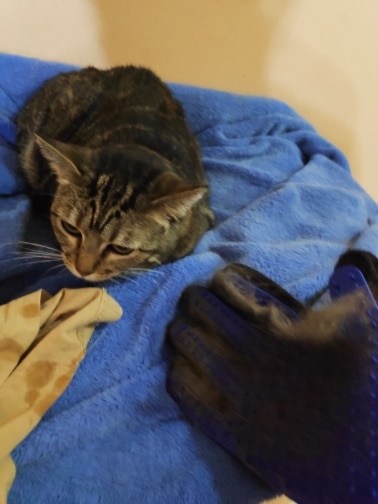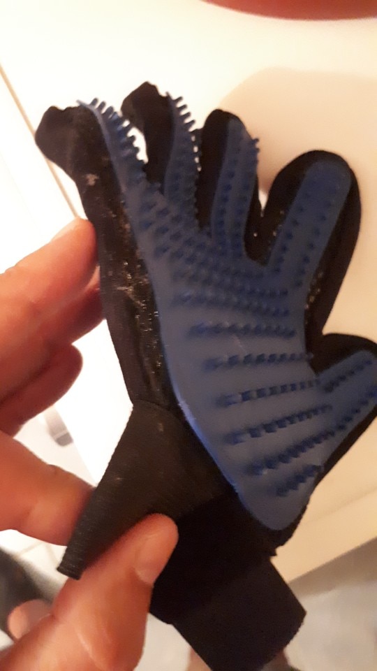 ¡Gran guante! El pelo se acumula en el guante, no hay olor extraño. El gato está contento.